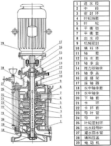 1)在管道將泵拆出。 2) 松開電機(jī)固定螺絲,移開電機(jī)。 3)用拉馬將聯(lián)軸器拉出,拆開軸承盒,松開填料壓蓋,取出填料。 4) 松開泵體螺絲,由上往下拆開泵體(要做記號(hào)),小心拆走密封件,并將葉輪及其軸套逐一拆出(注意先后)。 5)最后將軸取出。 裝機(jī)相反順序。 參考圖片: