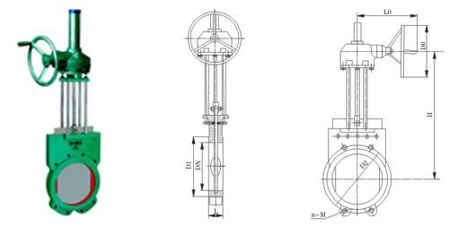 Z573X型傘齒輪液料閘閥,Z573X型傘齒輪傳動漿液閥,Z573X型漿液輸送閘閥的構(gòu)造圖及主要外形及連接尺寸(mm) |